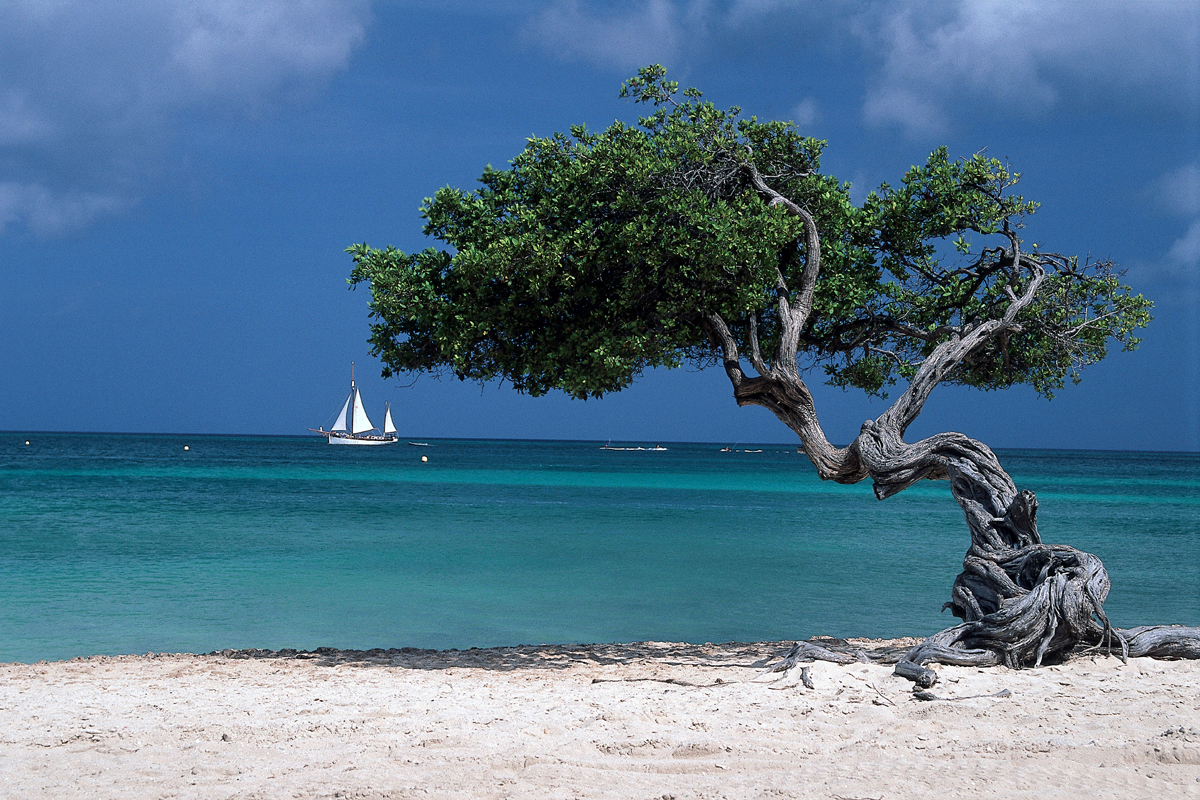 Осматриваюсь в поисках хозяев тарелки. Вот и они: парень с девушкой плещутся возле берега, где карибские волны бирюзового оттенка облизывают на белый, как зефир, песок пляжа Игл-Бич на острове Аруба. Невысокие, похожие на бонсай, деревья цезальпинии, или диви-диви растут прямо не песка и протягивают в сторону моря свои плоские кроны над изогнутыми, скрюченными ветром стволами. Эти деревья всегда отклонены к юго-западу из-за местных пассатов, которые дуют с северо-востока.