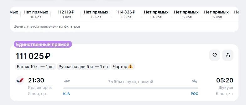 На сайте по продажам билетов указано, что полет на прямом рейсе в одну сторону обойдется минимум в 111 тысяч рублей.