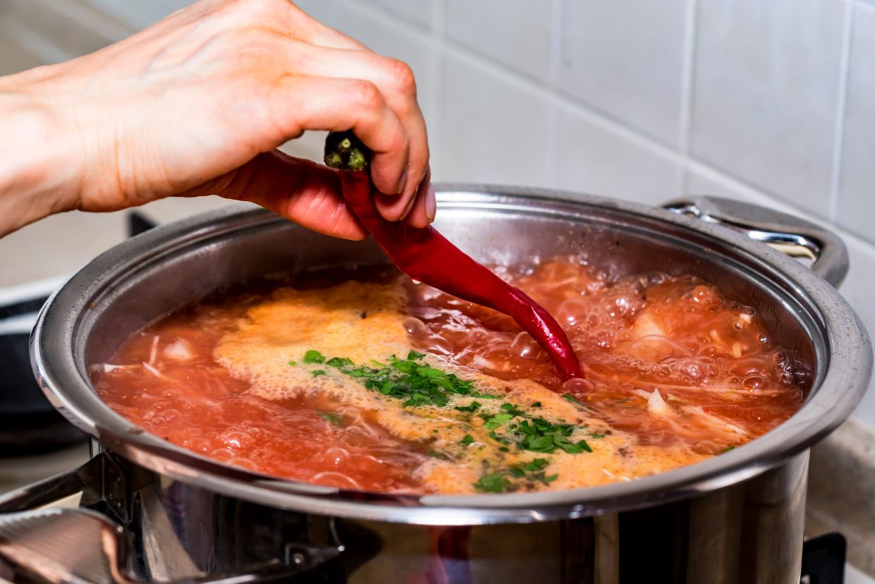 12. Вкус борща должен быть более кислым и слабосолёным. Добавляя сахар, вы уберёте лишнюю кислоту, но лишитесь остринки. В этом случае приправьте борщ соусом табаско, тёртым чесноком или перцем чили. Также вкус подчеркнёт свежий лимонный сок, чёрный молотый перец и свекольный сок. Посолите.