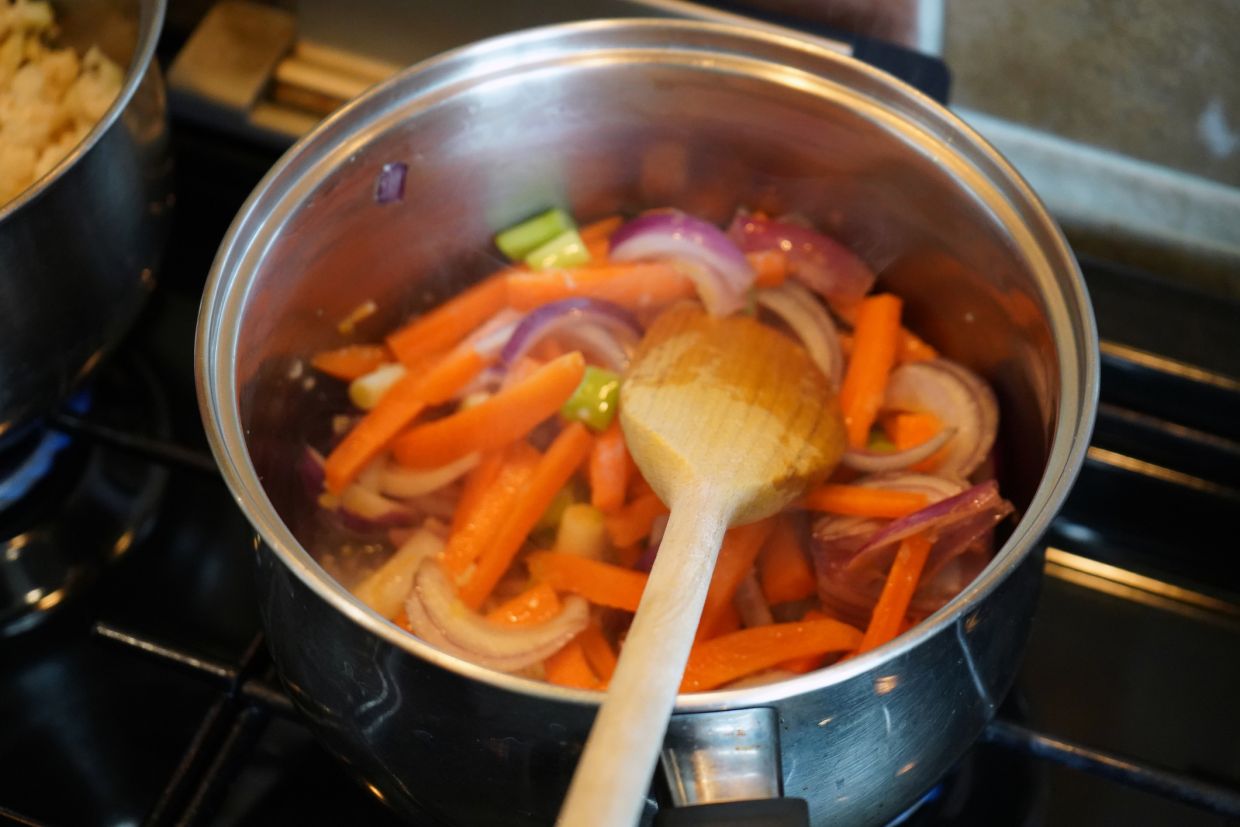 8. Растопите сливочное масло в отдельном сотейнике, добавьте лук и морковь. Обжарьте на среднем огне до карамелизации лука, затем добавьте консервированные томаты и сушёный чеснок. Перемешайте и переложите в кастрюлю с бульоном.