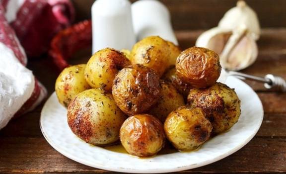 2. Полейте картофель ароматным маслом и перемешайте, чтобы равномерно покрыть. Выложите в форму одним слоем.