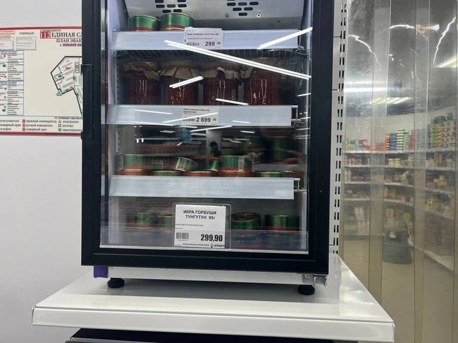Морепродуктов тоже особо не найти, кроме, пожалуй, икры. Она стоит в отдельном небольшом холодильнике, у входа в «холодильную комнату». Что удивляет: там продается пол-литровая банка красной икры за 2699 рублей. Кто это может себе позволить — вопрос.