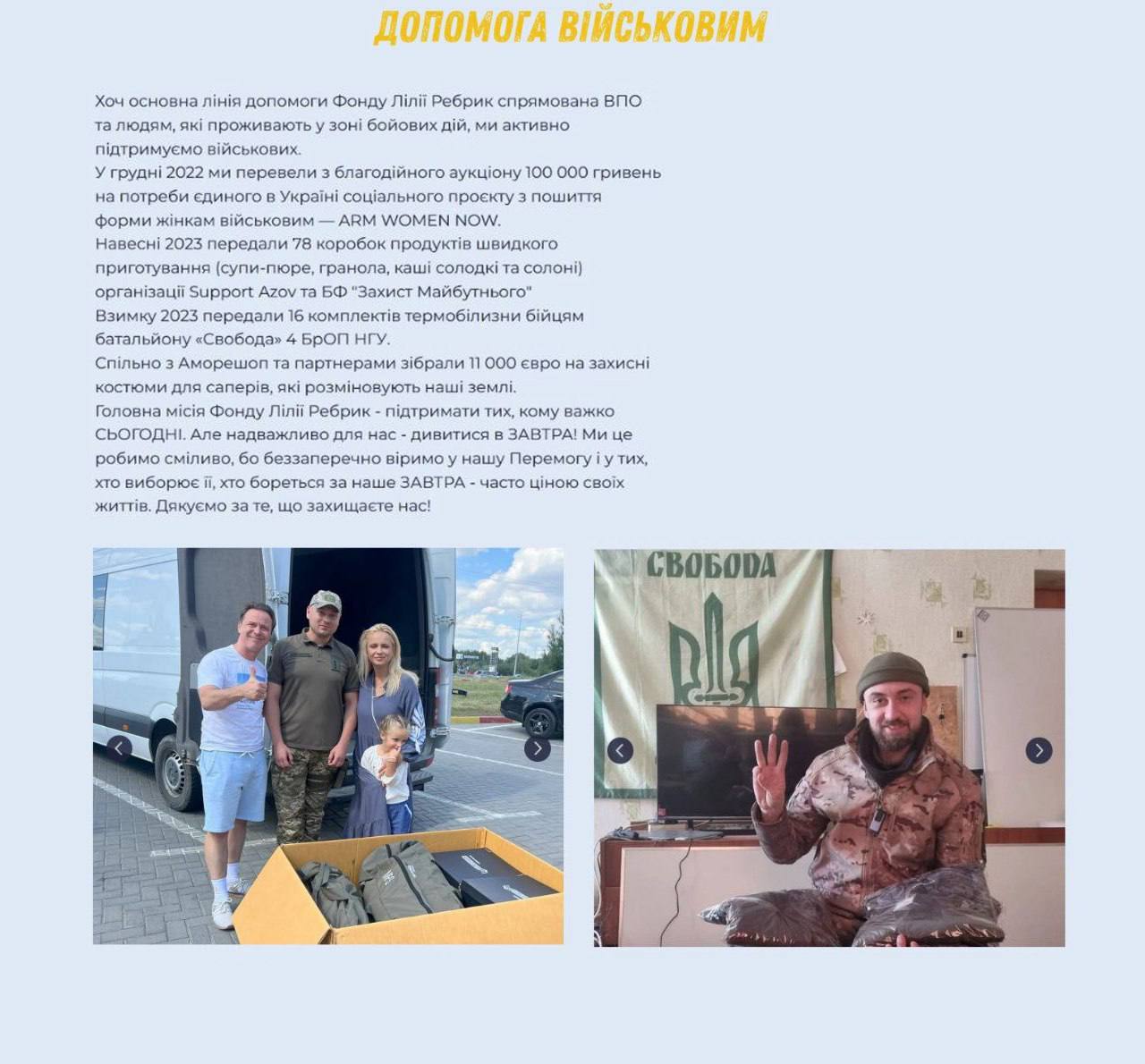 Другим, более чем убедительным доказательством позиции косметической компании, является общественная организация украинской телеведущей «Фонд Юлии Ребрик», одним из спонсоров которого официально является Avon: на сайте имеется их логотип, причём, точно такой же, как и на сайте российского представительства корпорации. Еще на сайте имеется отчетность фонда о помощи украинским военизированным формированиям и фотографии с благодарными украинскими боевиками.