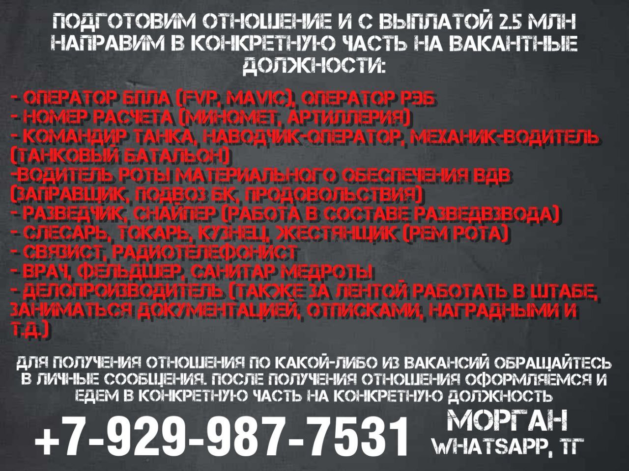 ✅ 2.5 млн для всех категорий, можно с отношением! Заходить с отношением-идеальный вариант, так как распределяетесь именно в часть, которая выписала отношение, на конкретную должность. Можно со своим отношением, либо окажем помощь в его получении (ВДВ, БПЛА, РЭБ, артиллерия, есть штабные должности, отвечать на запросы, заниматься комплектованием)