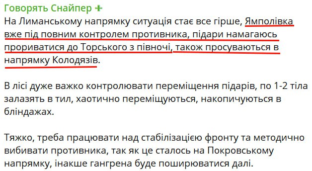 Околовоенные ресурсы противника сообщают о полном освобождении ВС РФ Ямполовки и начала штурма Торского с севера (и продвижении наших штурмовиков в направлении Колодязей).