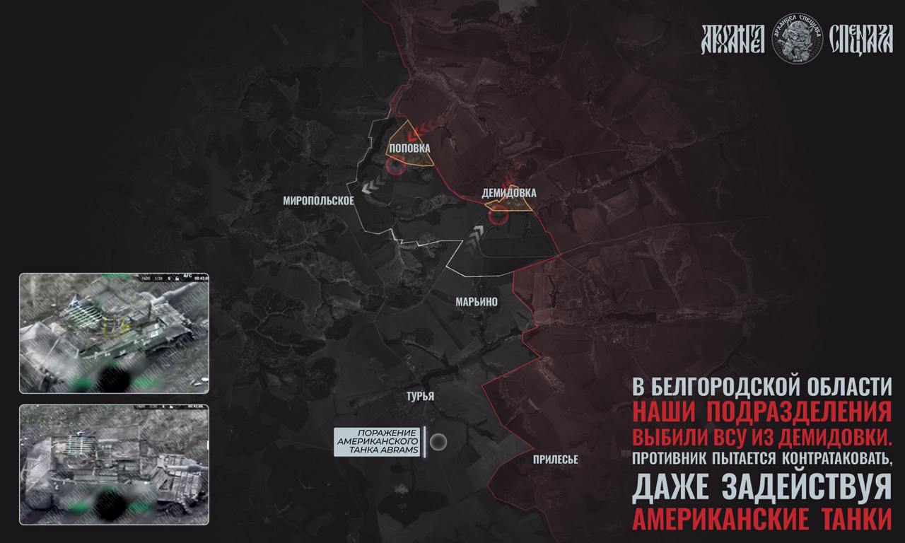 В Белгородской области с утра противник вновь попытался атаковать, для чего к приграничной линии стягивал даже бронетехнику. Один из танков «Абрамс» был поражен нашими подразделениями к югу от Турьи.