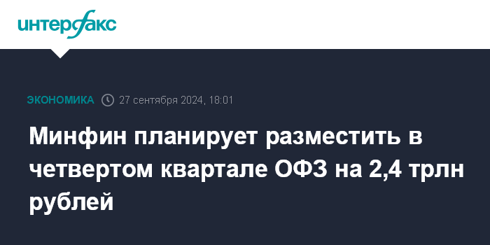 Москва. 27 сентября. INTERFAX.RU - Минфин существенно увеличил квартальные планы по размещению облигаций федерального займа (ОФЗ) - после слабого их исполнения во втором и третьем кварталах в октябре-декабре планирует разместить бумаги объемом до 2,4 трлн рублей по номинальной стоимости, следует из графика аукционов на сайте министерства.