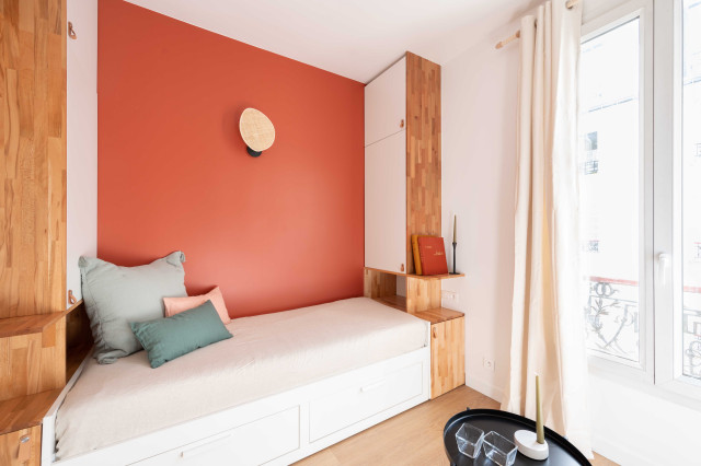 Для зоны сна Мари-Софи выбрала теплый терракотовый оттенок. «Он не перегружает пространство, ведь остальная часть квартиры оформлена в нейтральном белом с добавлением дерева и натуральных оттенков», — объясняет автор проекта.