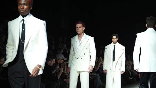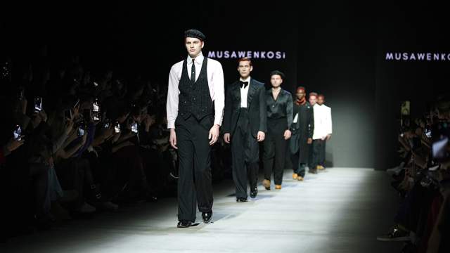Гости из ЮАР MUSAWENKOSi вдохновились ретро-классикой в коллекции мужских костюмов и презентовали на подиуме брюки с высокой посадкой, которые стилизовали и с шелковыми блузами, с расслабленно расстегнутыми верхними пуговицами, и со строгими рубашками с туго затянутыми галстуками и надетыми поверх жилетками. Главными цветами коллекции стали черный и белый. Разбавили гамму красные волосы моделей.