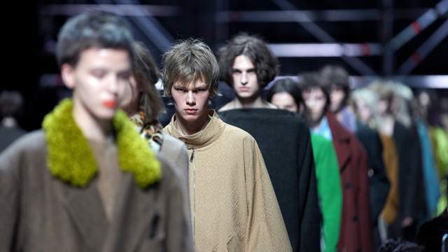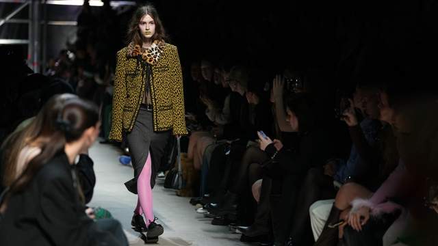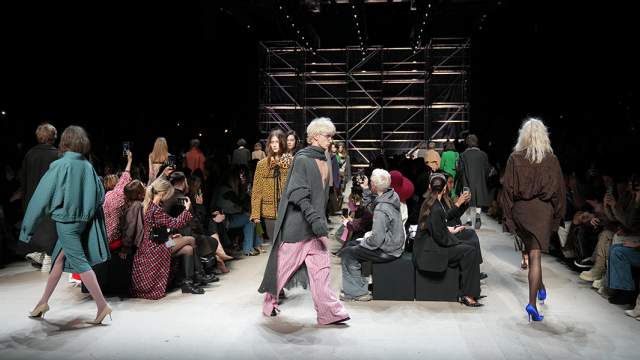Если в прошлом году у основания подиума был яркий занавес, в этот раз до потолка выросли грубые леса. Под стать дерзкой и хулиганской коллекции, где в одном образе сочетались леопардовый пиджак на зеленую рубашку, желтый меховой воротник, фиолетовые колготки и серебристые сапоги, в другом — серое пальто с цветным воротником на пижамные шорты и майку с кокетливыми белыми гольфами и классическими лоферами.