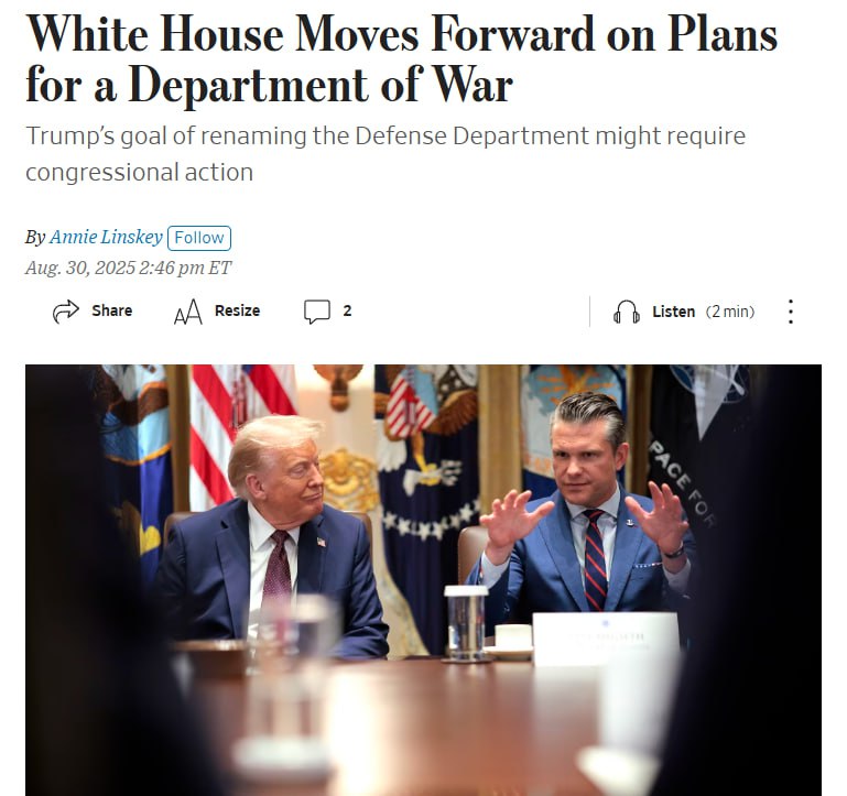 The Wall Street Journal: Трамп ищет пути, как в обход Конгресса переименовать Пентагон в «министерство войны».