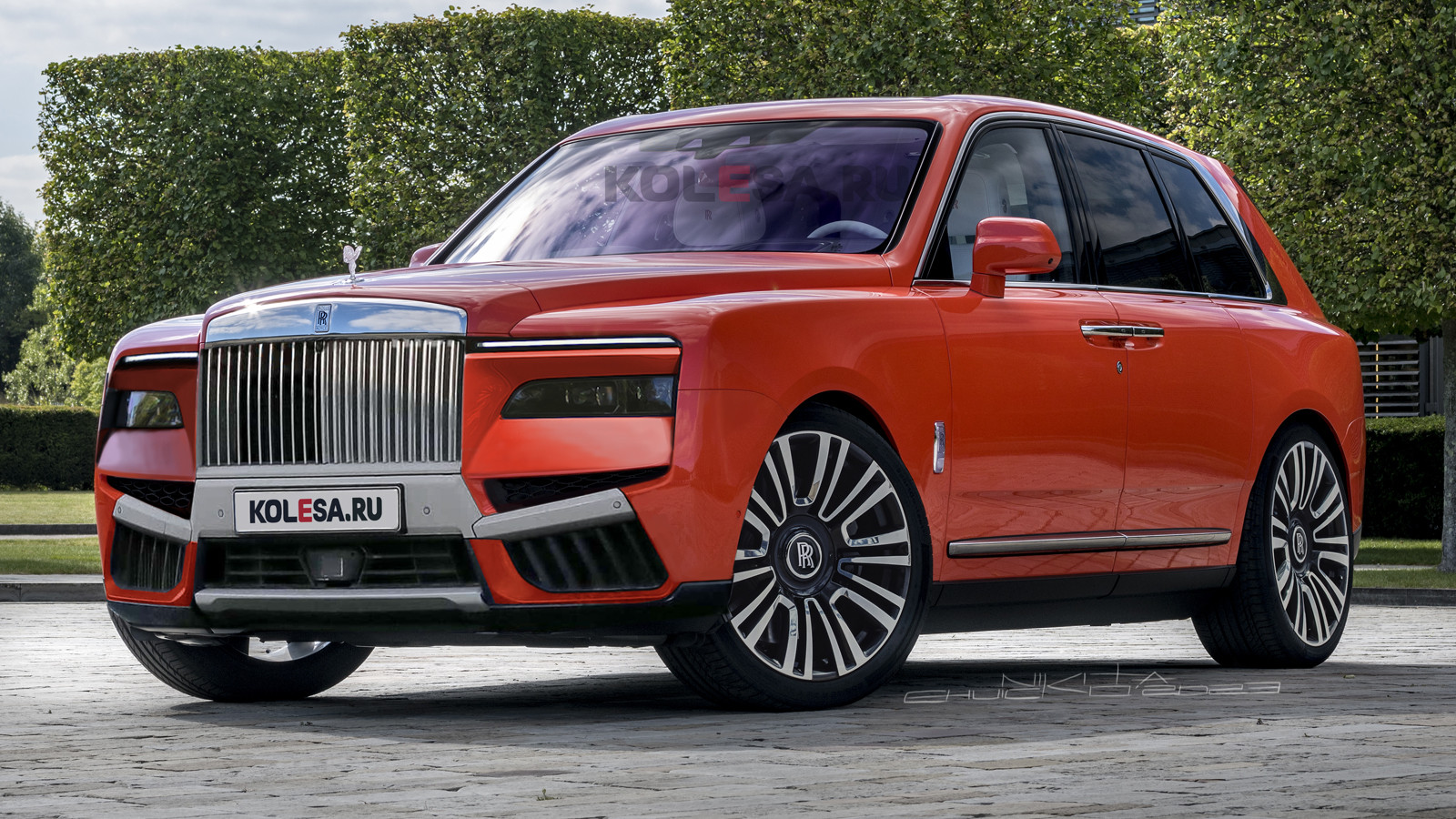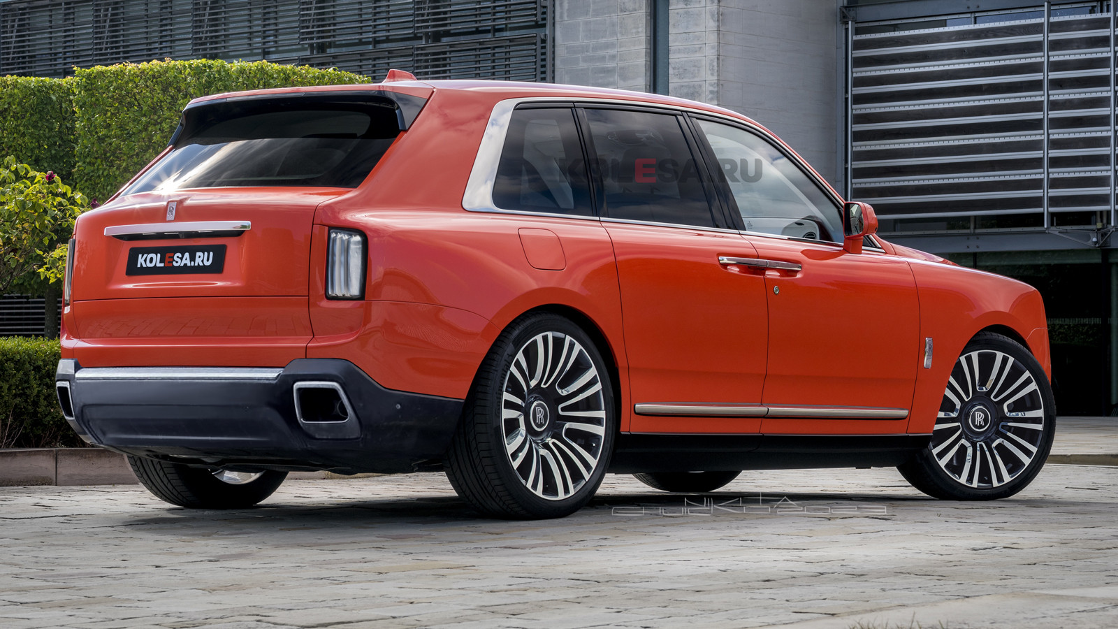 Самой оригинальной деталью на шпионских фотоснимках является новый передний бампер с совершенно нехарактерным для моделей Rolls-Royce дизайном. Он сделан в спортивном стиле, имеет пару крупных воздухозаборников с диагональными перекладинами и контрастные декоративные вставки. Передняя оптика пока частично скрыта маскировкой, есть вероятность, что Cullinan получит «двухэтажную» переднюю оптику в стиле первого электромобиля марки Spectre. Сзади на тестовых образцах можно увидеть немного изменённую по форме пластиковую накладку в нижней части, в которую встроены более крупные патрубки выхлопной системы. Фонари пока оставили неизменными, мы же представили вариант в стиле того же Spectre.
