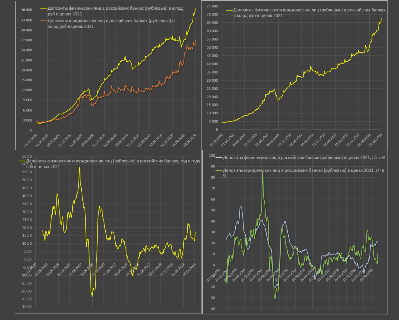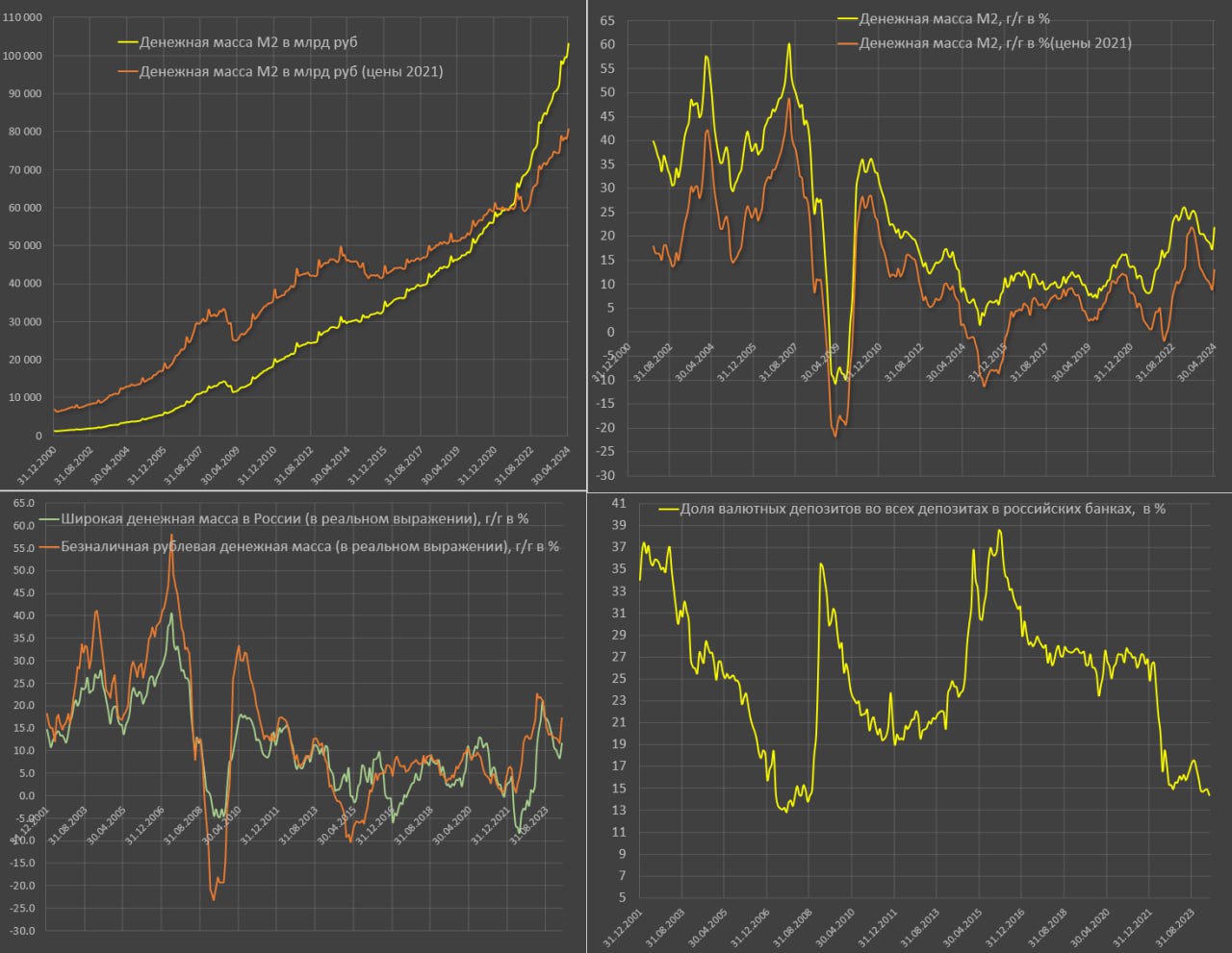 В апреле 2024 (последние официальные данные) рублевая денежная масса составила 103.1 трлн, - годовой прирост на 21.8%, что совпало с предварительной оценкой.