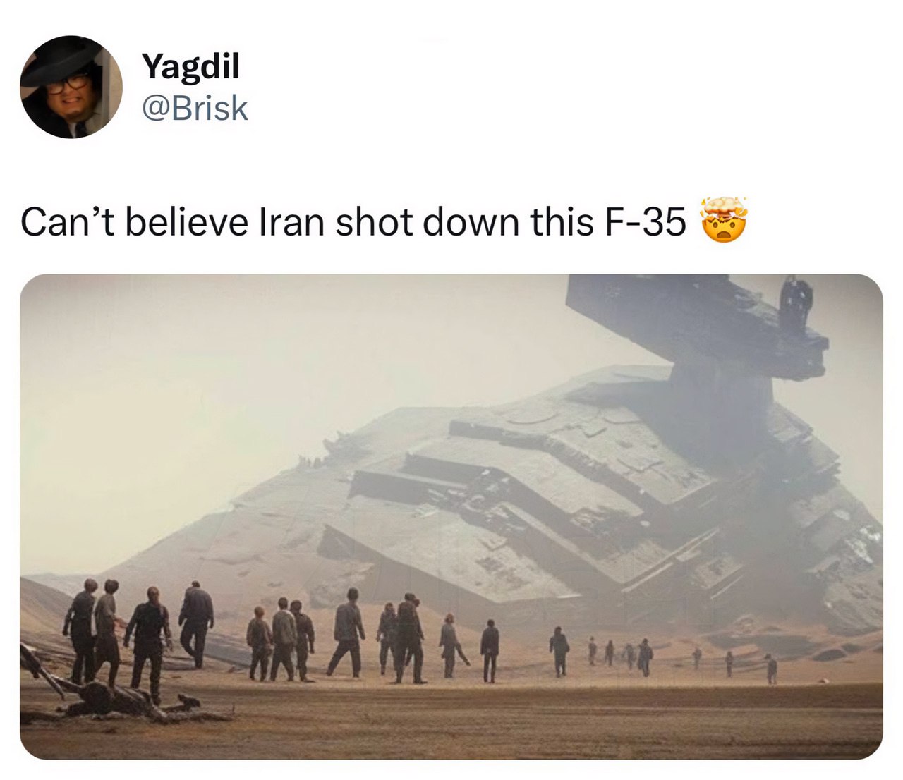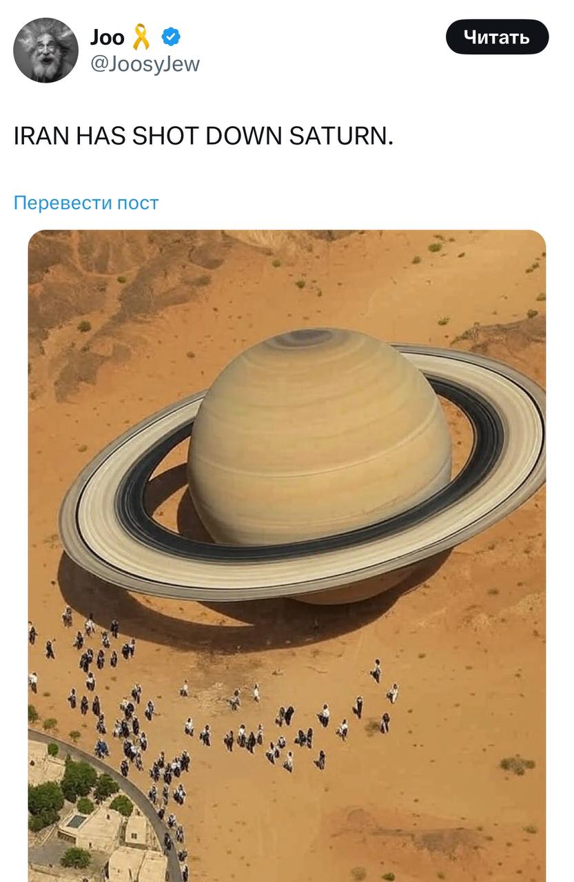 Анекдот дня: в Иране заявили, что якобы сбили израильский истребитель F-35, и в качестве доказательства приложили фотографию самолёта, длина которого более 100 метров, тогда как настоящий F-35 имеет длину всего 15 метров