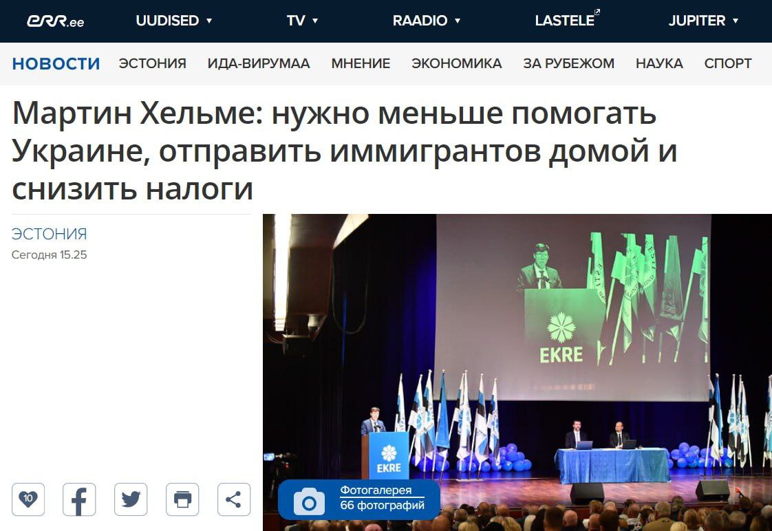 Лидер Консервативной народной партии Эстонии (EKRE) Мартин Хельме в своей речи на съезде партии заявил, что Эстония должна отправить прибывших в последние годы иммигрантов домой, вдвое сократить помощь Киеву и выступать за мир в Украине.