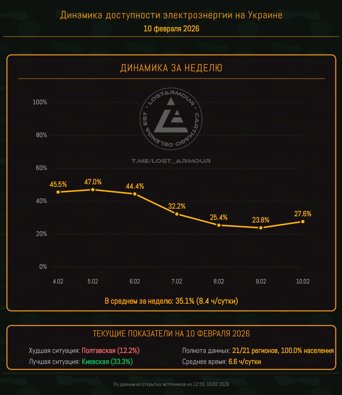 Инфографика доступности электроэнергии на территории Украины по областям на 10 февраля 2026.