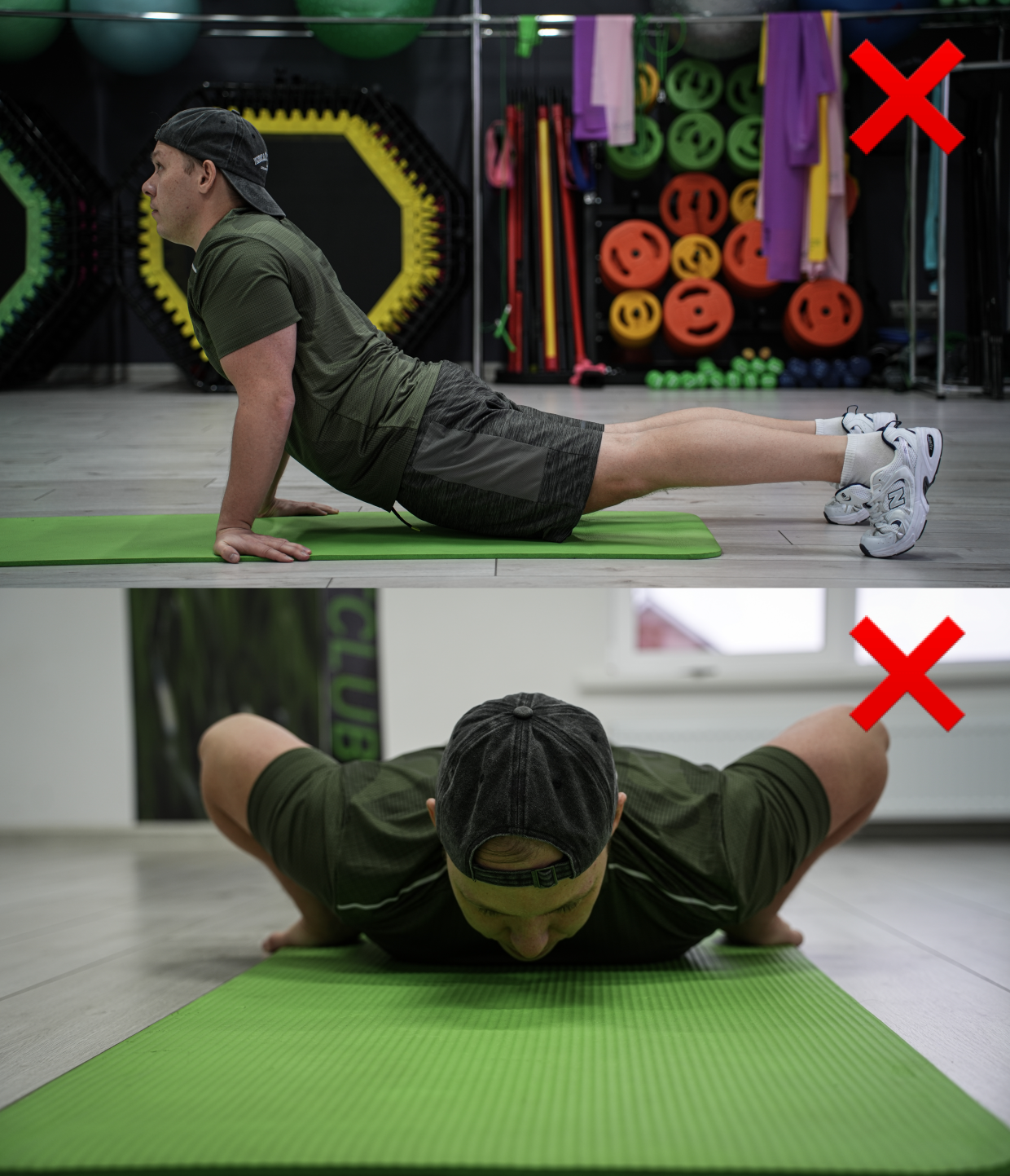 - Прогиб в пояснице. Снижает эффективность упражнения и может привести к травме. Следите за тем, чтобы тело образовывало прямую линию. Для этого напрягайте мышцы пресса и спины.