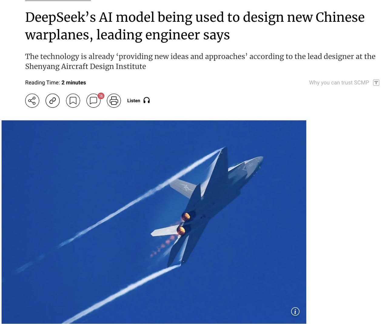 ❗️Китай использует собственную модель искусственного интеллекта DeepSeek для проектирования современных истребителей, таких как J-15 и J-35, а также для создания самолетов следующего поколения, таких как J-36 и J-50