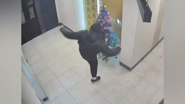 В Воронеже парень ногой снес елку в подъезде. Инцидент произошел на улице Ворошилова 63/2. Кадрами инцидента поделились горожане в социальных сетях.