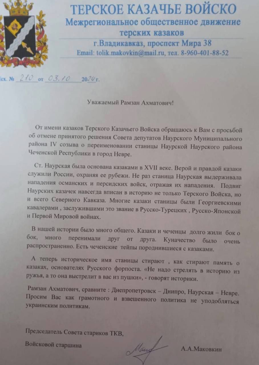 Тема — оскорбительное для всех казаков, в т.ч. тех, кто сегодня проливает кровь на фронте, переименование станицы Наурской в город Невре.