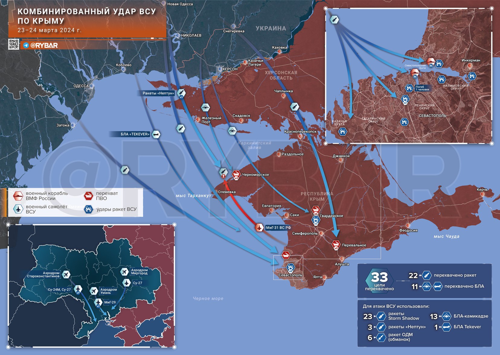 Уже на следующий день после теракта в Москве украинские формирования провели массированную комбинированную атаку по Крымскому полуострову, в которой было задействовано не менее 12 самолётов тактической авиации.