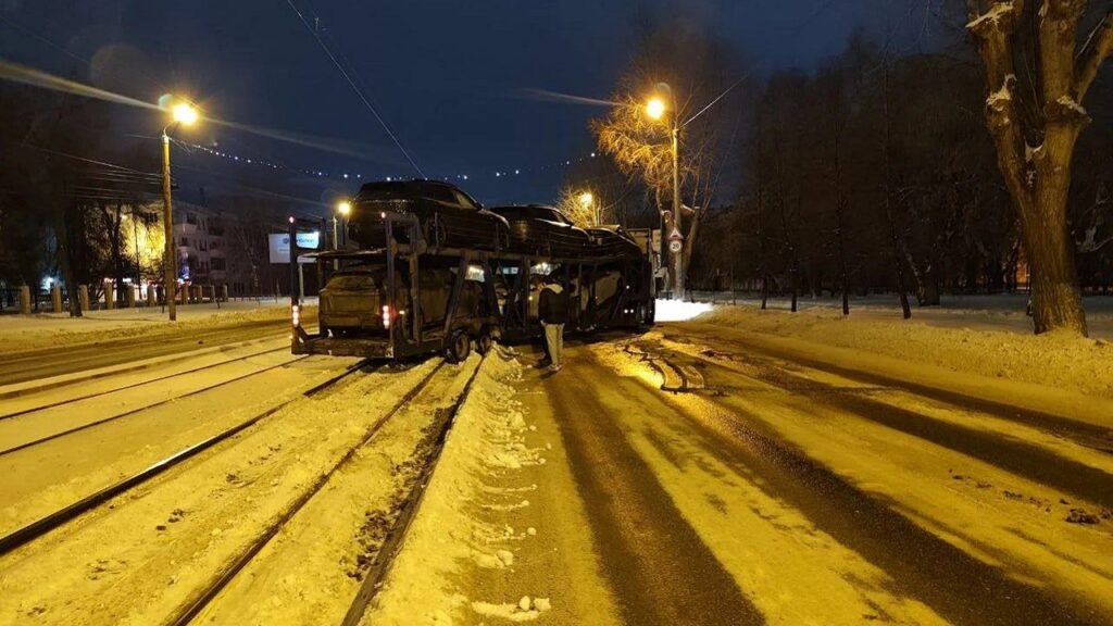 Случай произошел накануне, 22 декабря, в Тракторозаводском районе. Водитель автовоза решил пересечь трамвайную ветку на улице Горького (возле перекрестка с улицей Савина), несмотря на то, что делать это в этом месте запрещено. В результате большегруз застрял и утром на два часа заблокировал проезд в обоих направлениях сразу для нескольких маршрутов, связывающих Тракторозаводский и Ленинский районы с другими частями города.