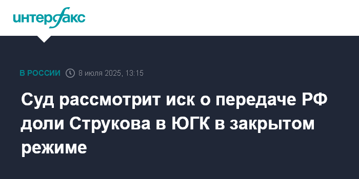 Москва. 8 июля. INTERFAX.RU - Советский районный суд Челябинска удовлетворил ходатайство представителей ответчиков о рассмотрении в закрытом судебном заседании иска об обращении в доход государства доли основного владельца ПАО "Южуралзолото группа компаний" (ЮГК) Константина Струкова в обществе и УК ЮГК, а также долей связанных с ним лиц в ряде компаний, передал корреспондент "Интерфакса" из зала суда.