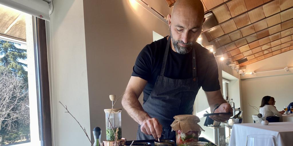 Y porque es verdad que cocina su entorno pero también que en su menú aparecen platos y fondos clásicos con recurrencia. Y que en su menú hay brotes de pino, setas y conejo, pero también espardeñas, calçots y guisantes del maresme. Y es verdad que presta una especial atención a la parte vegetal pero también le pega fuerte a la butifarra y los erizos. Y que trata de simplificar y aligerar su cocina pero que termina su menú con una codorniz rellena de foie gras y trufa, una blanqueta de conejo y una tarta de manzana. Que ya es malagueño pero nunca dejará de ser catalán. Que no le gusta el discurso pero tiene uno mucho más nítido que la mitad de los impostados que circulan por ahí. Que, en definitiva, Benito es un mar de contradicciones que, en el fondo, el comensal no percibe porque en su menú todo parece fluir con una naturalidad pasmosa.