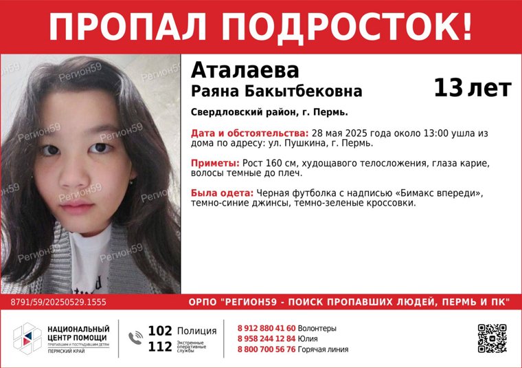 В Перми объявлены поиски 13-летней Раяны Аталаевой. Последний раз девочку видели накануне, 28 мая, когда она вышла из своего дома в Свердловском районе. О пропавшей сообщается на страницах поисковых отрядов «Лиза Алерт» и «Регион 59 — поиск пропавших людей».