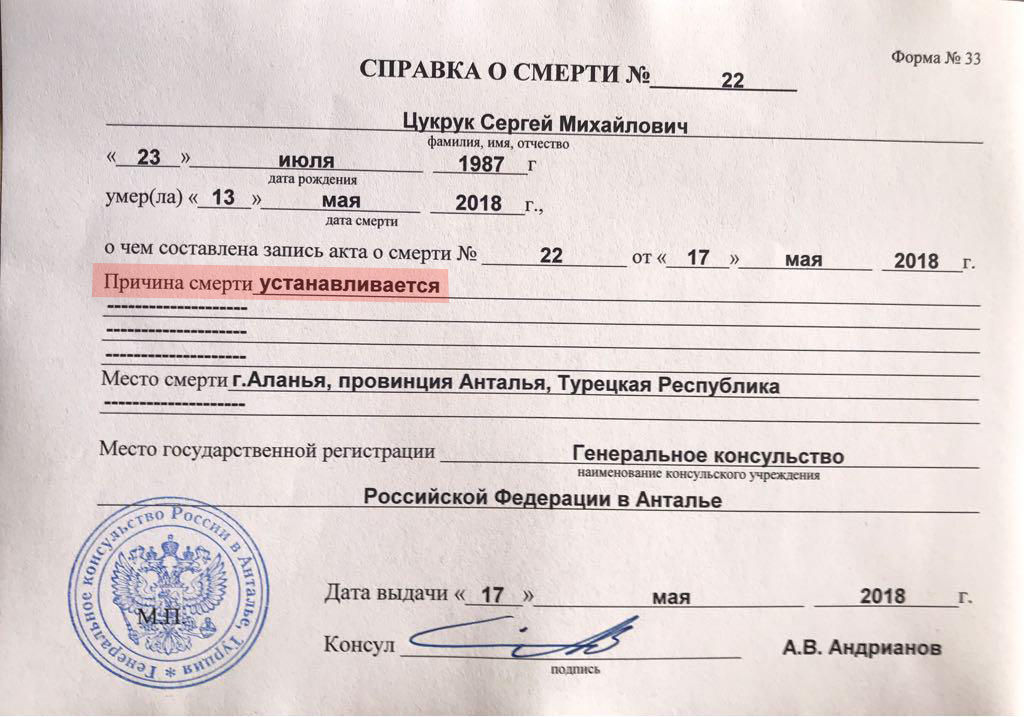 — На шее Сергея отсутствовала странгуляционная борозда от повешения. Через два дня после случившегося, 5 мая, я, отец Сергея и моя дочь прилетели в Турцию и видели сына в палате интенсивной терапии — его шея была идеально чистой, — пояснила Наталия Цукрук. — Отсутствие на шее следов от ремня подтверждается в отчетах больницы с 3 по 13 мая. В день осмотра тела Сергея комиссия в присутствии прокурора Аланьи также установила и зафиксировала, что — дословно — «каких-либо следов на шее от веревки, проволоки, ремня и прочего не обнаружено».