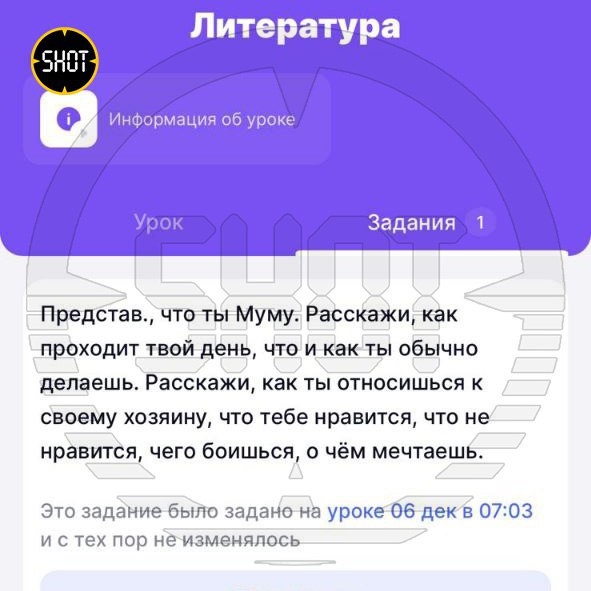 Как стало известно SHOT, родительский гнев обрушился на кринжовое ДЗ, которое учительница лицея «Авиатика» задала по литературе пятиклашкам. По словам родителей, электронный дневник педагог Арувхан Вазировна написала школоте, что им нужно вообразить себя собачкой Муму из одноимённой повести Тургенева: рассказать, а может, и прогавкать, как проходит день, что нравится, а что нет, чего боишься, о чём мечтаешь.