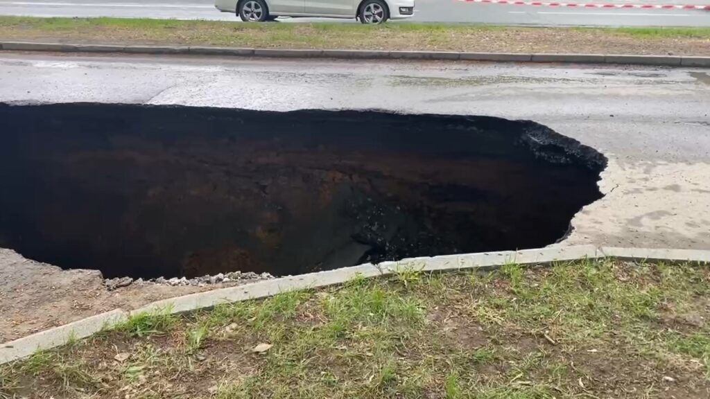 Кадры, снятые очевидцем – широкая трещина на улице Первой Пятилетки в считанные минуты превращается в огромную яму. На глубине около трех метров течет мутная вода.