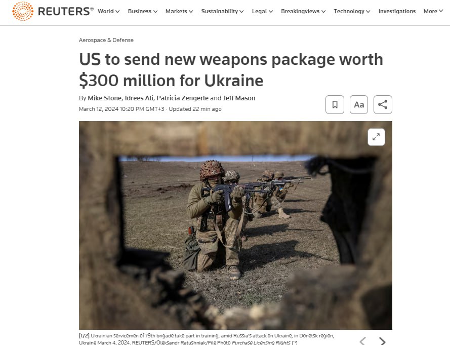США отправят Украине новый пакет вооружений на $300 млн, сообщает Reuters