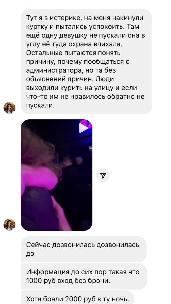 — Администратор повернула голову к охране и сказала, чтоб меня не пускали. Я в шоке. Стою в майке на холоде, и меня реально не стали пускать несмотря на то, что в зале находились наши другие сотрудницы и у нас стол забронирован. Естественно, я начала пытаться прорваться! Но четыре охранника выпихнули меня. У меня случилась истерика. Я, конечно, позволила себе оскорбление в их адрес. Даже не давали вещи свои забрать! Помимо меня еще одну девушку так же не пускали, она не могла найти бирку и из-за этого ее не пускали, а сильно выталкивали.