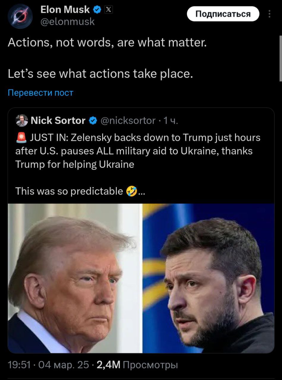Илон Маск прокомментировал пост Зеленского*, который написал, что согласен работать под твёрдым руководством Трампа.