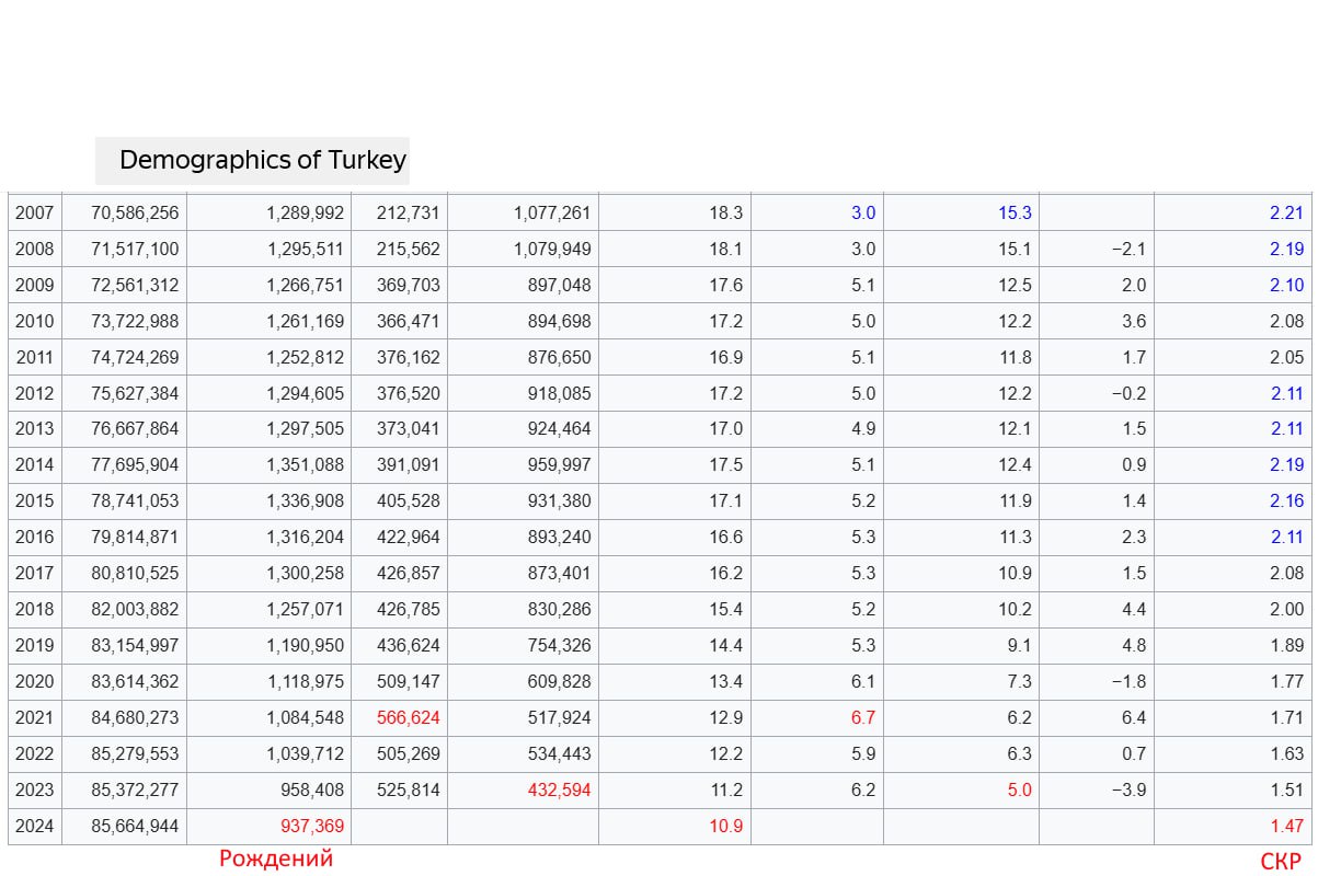 Причем, падение рождаемости в эти годы в стране буквально обвальные. И если на протяжении последних десятилетий среднее количество рождений в стране составляло цифру от 1,3 до 1,4 млн. человек., то по итогу 2024 года официально зарегистрировано 937 тыс. рождений. А без учета сирийских беженцев и вовсе 907 тыс.ч. (см табл.1).