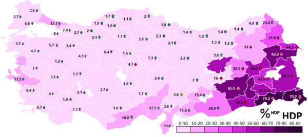 Таким образом общее число курдов в Турции никак не меньше 25 млн.ч. (а скорее ближе к 30 млн.), которых правительство Ердогана пытается растворить в турецкой массе, но оно, как мы видим по выборам, даже разговаривая по-турецки, считает себя курдами. И голосует за курдские национальные партии.