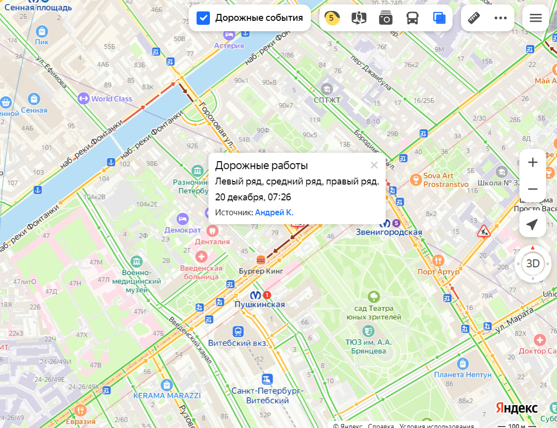 На Гороховую улицу в центре Петербурга утром 20 декабря не вышли троллейбусы из-за работ на месте обрушения дома. На улице наблюдается затор. Пользователи «Яндекс.Карт» поставили у перекрёстка с Загородным отметку о дорожных работах.