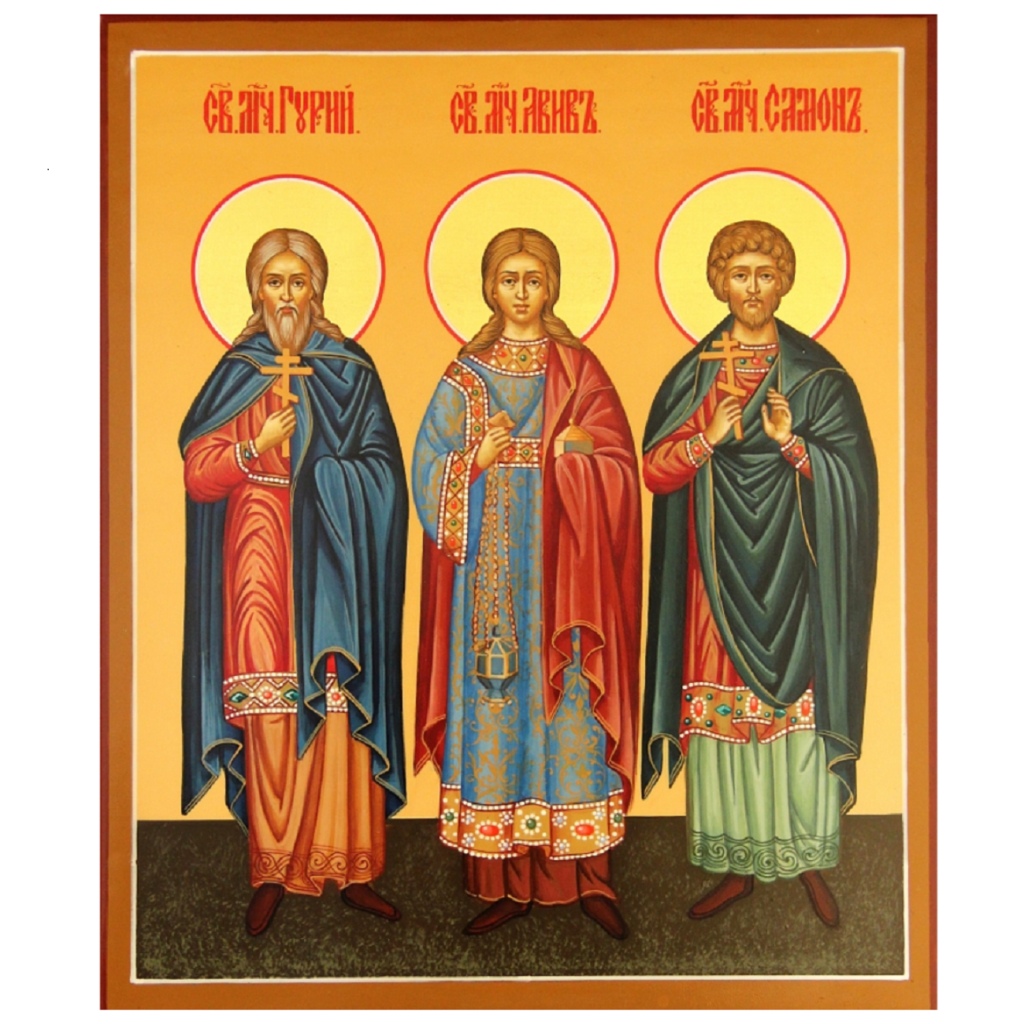 Православная Церковь чтит память трех святых мучеников — Гурия, Самона и Авива. Миряне Гурий и Самон проживали на стыке III и IV столетий в городе Эдесса. С наступлением преследований христиан при императоре Диоклетиане покинули родные места. Их поймали и принуждали поклоняться языческим божествам. Оба остались тверды в своей вере. За отказ принять языческие обычаи мученики претерпели жестокие мучения и долгое заключение в тюрьме. Впоследствии их казнили через отсечение головы.