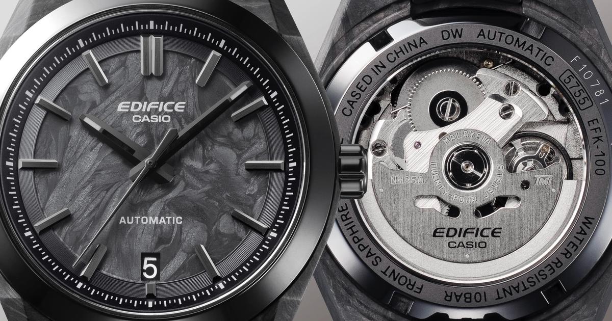 C’est au sein de sa marque Edifice, créée il y a tout juste 25 ans, qu’elle les propose, avec cinq nouveaux modèles au mouvement automatique à remontage mécanique, dont une arborant un boîtier et un cadran en carbone forgé. Et ce à seulement 449 €, pour des pièces emboîtées en Chine, comme cela est précisé en toutes lettres au dos de ces montres. La référence EFK-100CD à trois aiguilles propose également un cadran en carbone forgé avec affichage de la date à 6 heures, mais associé à un boîtier et bracelet en acier inoxydable, pour 299 €. Quant aux trois versions au cadran coloré ( vert, bleu et blanc), ils sont proposés à seulement 249 €. Seul bémol : rien de moins poétique et de moins communicant que de baptiser des montres par des références dignes d’un tableur Excel. Un défaut hélas courant au sein des maisons horlogères japonaises.
