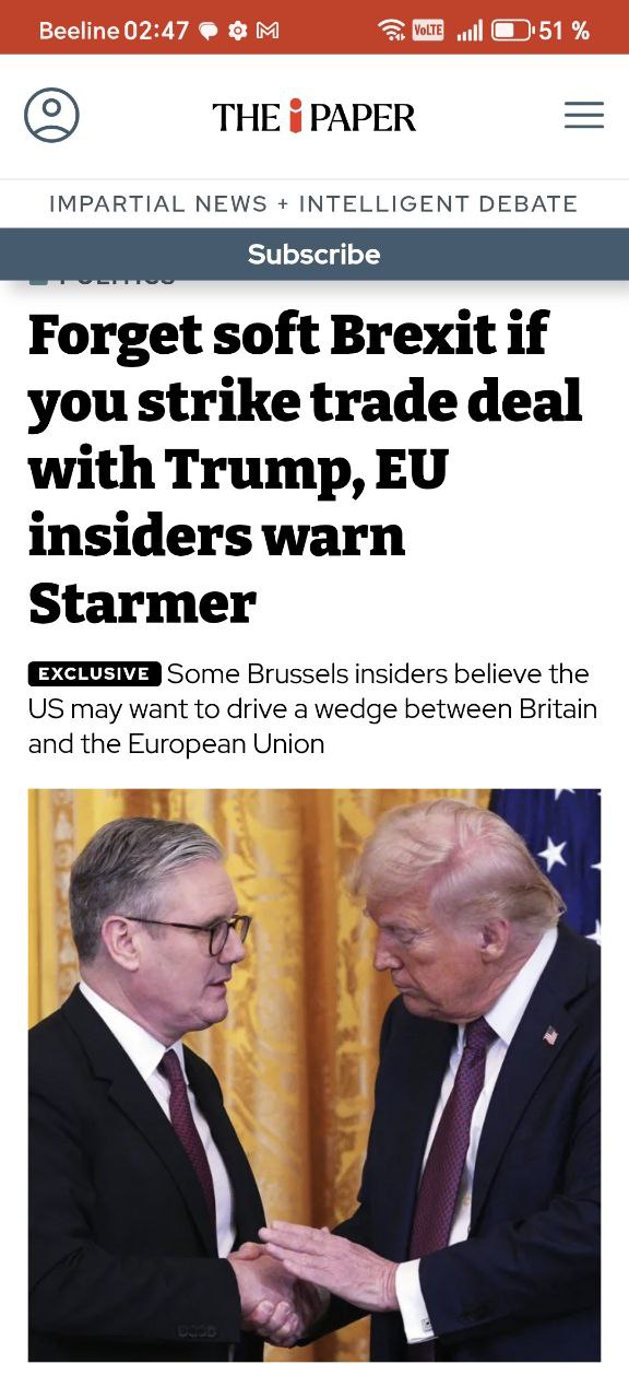 Британское издание The i Paper сообщает, что «Соединенные Штаты используют возможность торгового соглашения с Лондоном, чтобы разжечь раздор с ЕС».