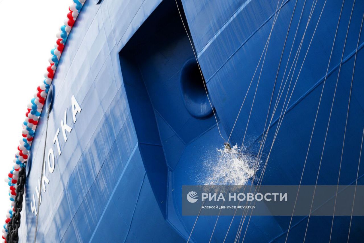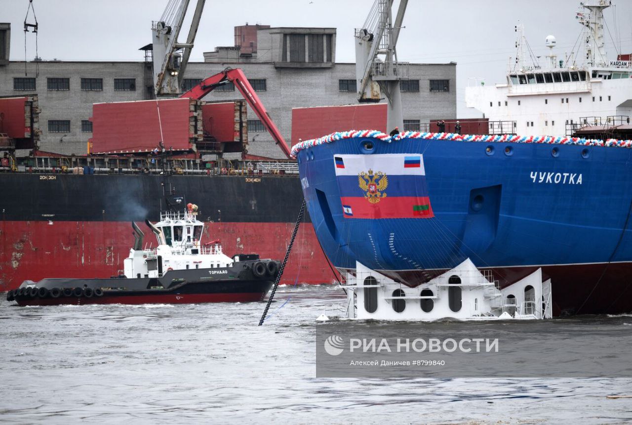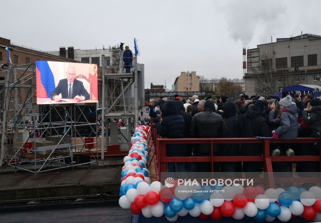 Владимир Путин в режиме видеоконференции принял участие в торжественной церемонии спуска на воду атомного ледокола "Чукотка" (проекта 22220) на Балтийском заводе Объединенной судостроительной корпорации (ОСК) в Санкт-Петербурге.