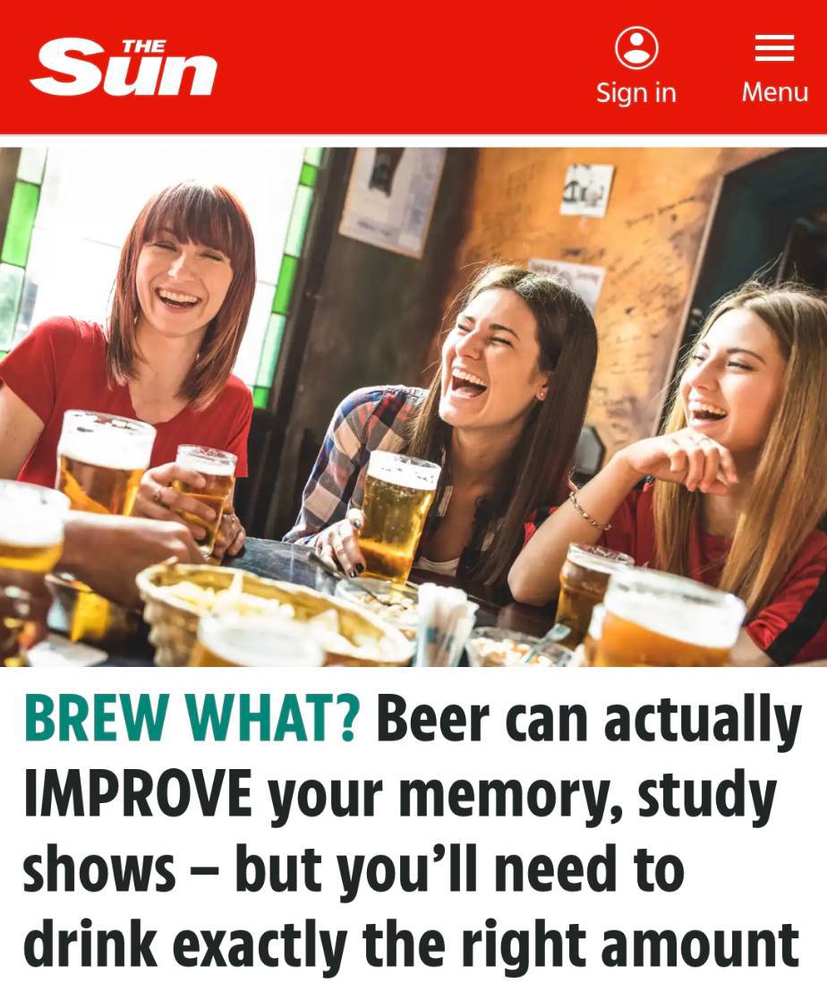 «Согласно исследованию, пиво улучшает память – это удивит любого, кто слишком много выпил вечером. Оказалось, что пинта пива в день приносит пользу мозгу: у тех, кто пил регулярно, память лучше, чем у трезвенников. У 1652 человек спросили о привычках употреблять алкоголь, а затем провели тесты на скорость