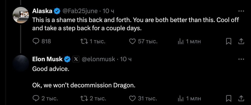 Β«Π₯ΠΎΡΠΎΡΠΈΠΉ ΡΠΎΠ²Π΅Ρ. ΠΠΊ, ΠΌΡ Π½Π΅ Π±ΡΠ΄Π΅ΠΌ Π²ΡΠ²ΠΎΠ΄ΠΈΡΡ Dragon ΠΈΠ· ΡΠΊΡΠΏΠ»ΡΠ°ΡΠ°ΡΠΈΠΈΒ» β Π½Π°ΠΏΠΈΡΠ°Π» ΠΠ°ΡΠΊ.