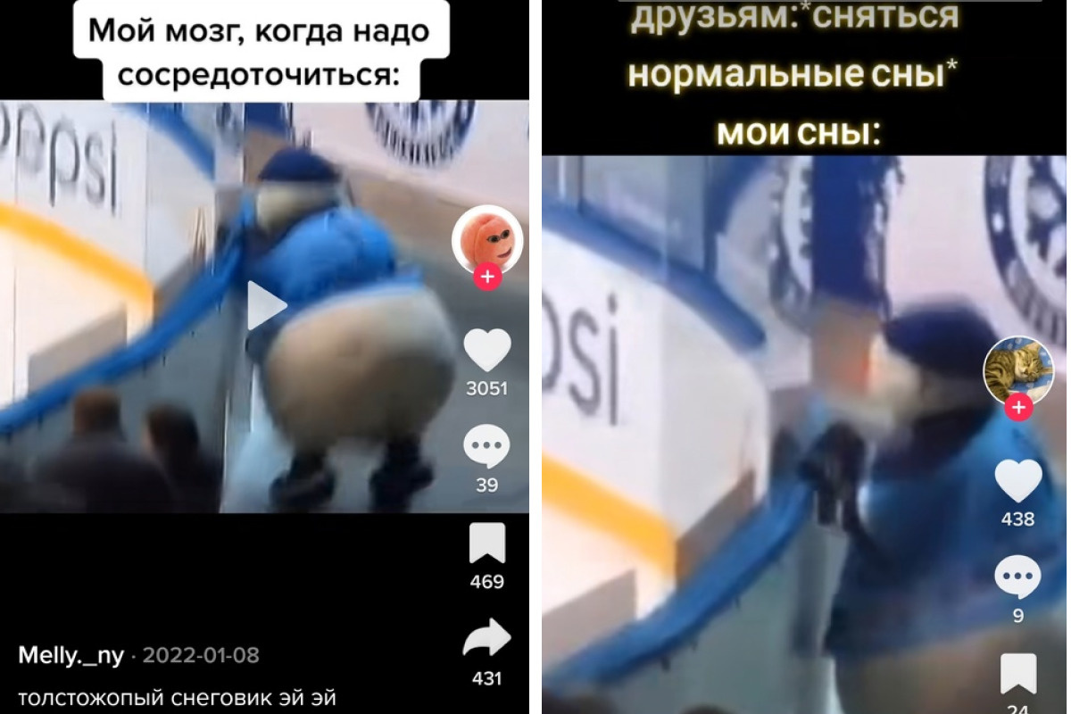 В конце прошлого года в «ТикТоке» мемом стало видео с игры ХК «Сибирь», где фанаты кричали про толстожопого снеговика — маскота хоккейного клуба.