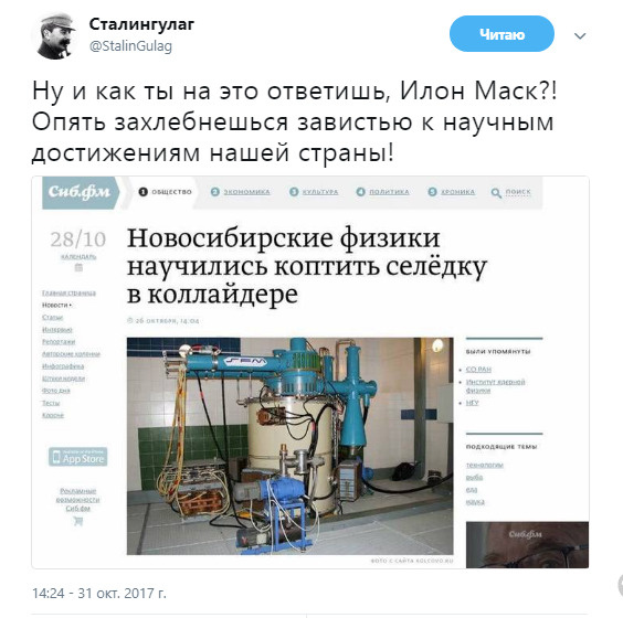 Авторы материала утверждают, что фраза появилась в 2017 году в блоге «Сталингулаг», который таким образом отреагировал на новость из Новосибирска о том, что новосибирские физики научились коптить селедку в коллайдере.