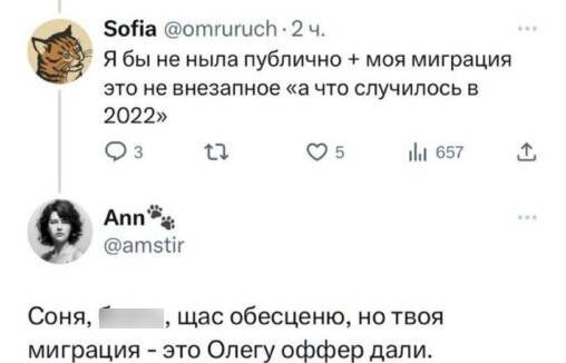 Инфоповодом к материалу стал недавно появившийся мем: «Соня, блин (мы изменили более грубое слово на цензурное), щас обесценю, но твоя миграция — это Олегу офер дали». Как узнала редакция НГС, автором комментария стала жительница Новосибирска Анна.