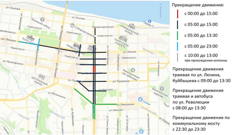 - с 10:00 до 13:00 ограничат движения для всех транспортных средств на время прохождения колонны по улице Попова (от Петропавловской до Пермской).