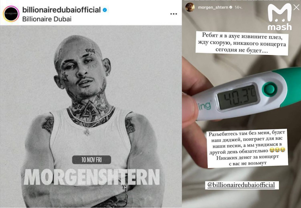 Выступление в клубе Billionaire, запланированное на 10 ноября, сорвалось за несколько часов до начала. Как нам стало известно, на площадку позвонили из службы безопасности Дубая и сообщили: концерта Моргенштерна не будет, и точка. Рэпер же объяснил отмену плохим самочувствием и фото с градусником и температурой 40,3. Правда, спустя два дня он чудом исцелился и уже вовсю хвастался кешем, который заработал на очередном корпорате.