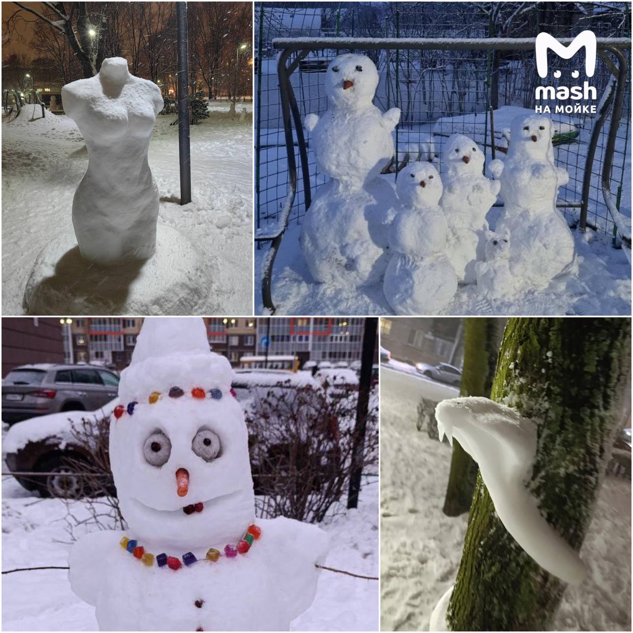 Тех, кто снега не боится, оказалось больше — куда ни глянь, везде снеговики. Некоторые питерские эстеты вовсе отличились и слепили снежную Венеру Милосскую и символ наступившего года на дереве. Ваш ход, подписчики — делитесь в комментах фотографиями местных снеговичков.